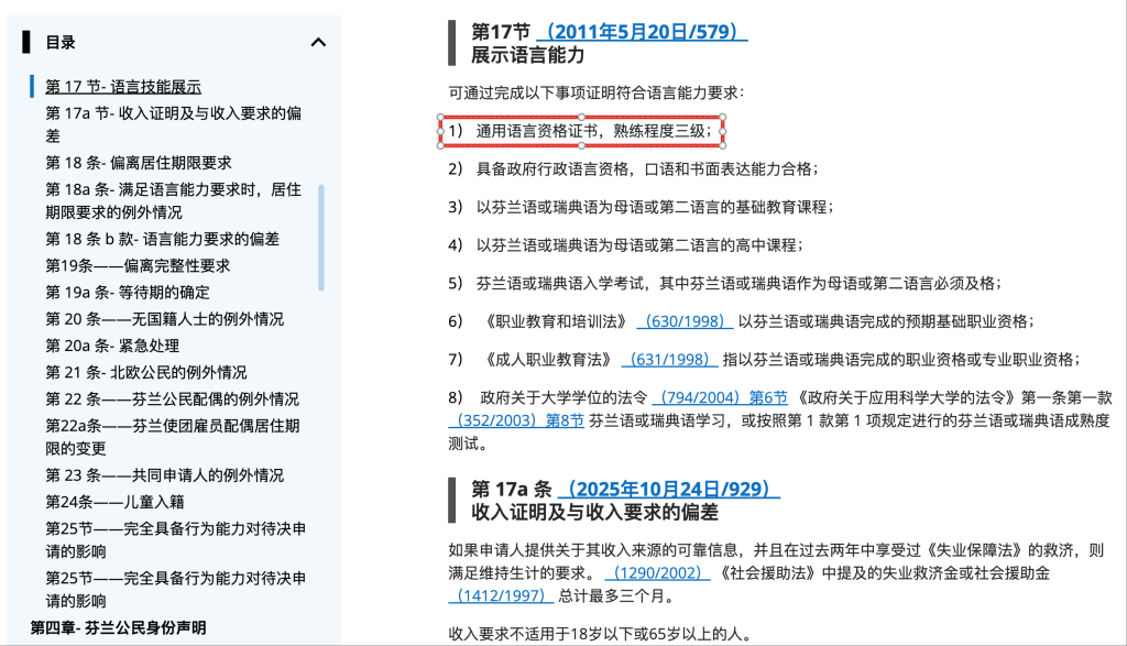 芬兰公民法,对「申请芬兰国籍」的人的语言技能要求: